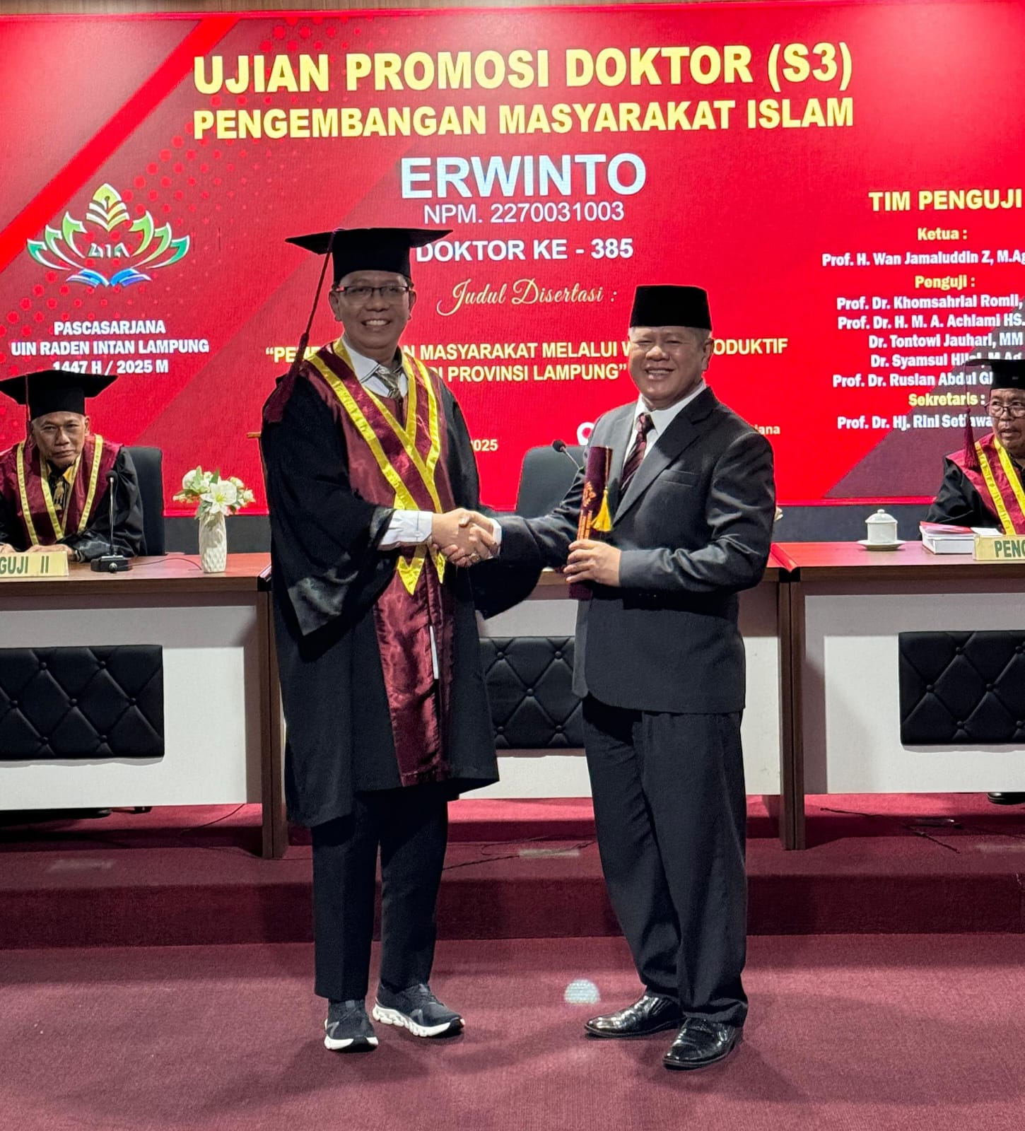 Dalam ujian tersebut, Erwinto memaparkan disertasinya yang berjudul “Pemberdayaan Masyarakat Melalui Wakaf Produktif Provinsi Lampung.” Ia menguraikan gagasan mengenai penguatan Badan Wakaf Indonesia (BWI), peningkatan kapasitas nazhir, penguatan literasi wakaf, hingga pentingnya digitalisasi sebagai pilar utama pengembangan wakaf produktif untuk kesejahteraan masyarakat.
