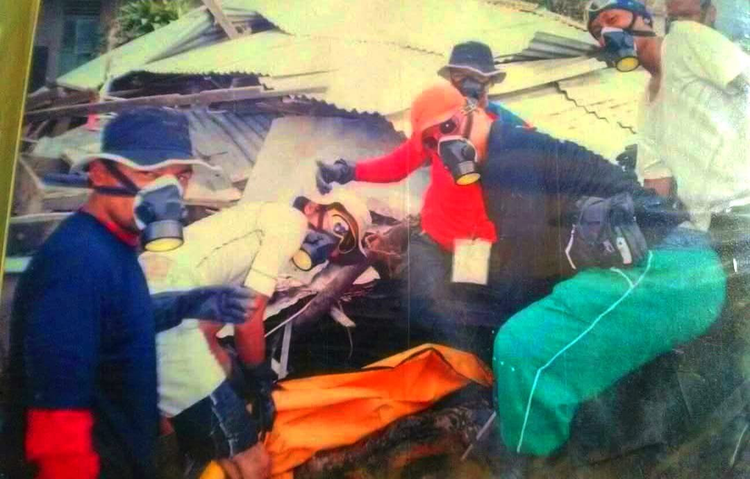 Saat menemukan tubuh pertama yang akan dievakuasi, hening seketika. Tubuh itu masih berada di antara reruntuhan kayu dan bata. Dengan alat pengangkat, kami mulai bekerja. Tangan bergetar, napas tercekat di balik masker moncong babi, tapi fokus kami hanya satu: menghormati korban dan menyelesaikan tugas dengan aman.