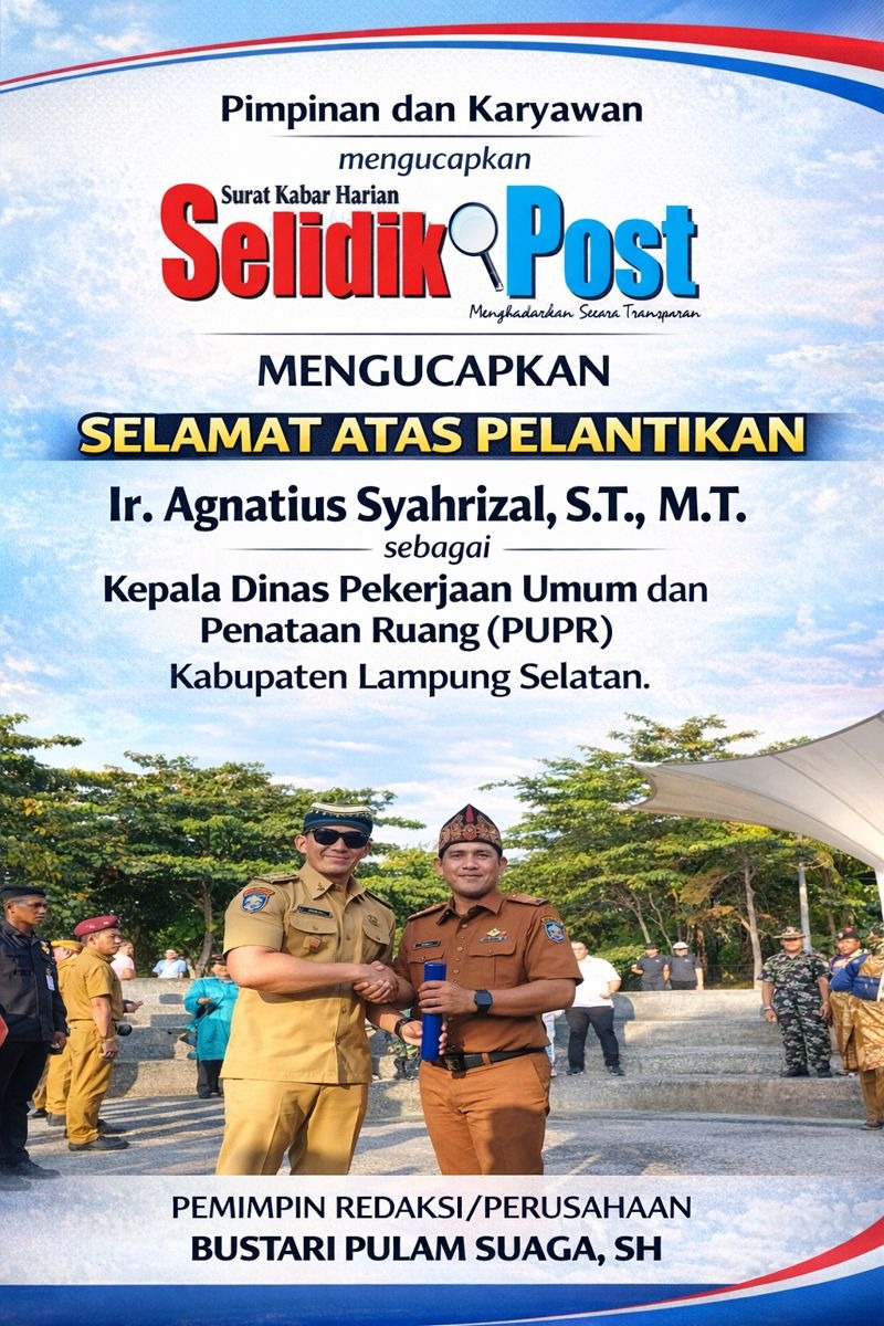 SelidikPost.com, Bandar Lampung – Segenap pimpinan dan karyawan surat kabar SelidikPost mengucapkan selamat kepada Ir. Agnatius Syahrizal, S.T., M.T., yang baru saja dilantik sebagai Kepala Dinas Pekerjaan Umum dan Penataan Ruang (PUPR) Kabupaten Lampung Selatan.