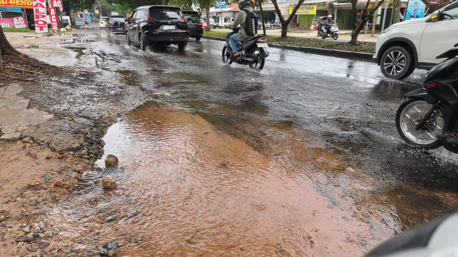 Menurut laporan warga, kebocoran pipa terjadi sejak Minggu malam pukul 23.30 WIB, sehingga air yang keluar dari pipa pecah mengalir deras ke badan jalan dan membentuk genangan. Kondisi ini membuat kendaraan yang melintas harus memperlambat laju.