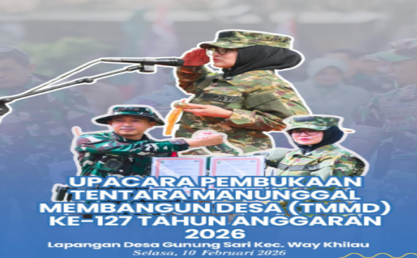 SelidikPost.Com, Pesawaran – Bupati Pesawaran Hj. Nanda Indira B. bertindak sebagai inspektur upacara pada Pembukaan Program TNI Manunggal Membangun Desa (TMMD) ke-127 Tahun 2026 yang dilaksanakan oleh Kodim 0421/Lampung Selatan di Lapangan Desa Gunung Sari, Kecamatan Way Khilau, Selasa (10/2/2026).