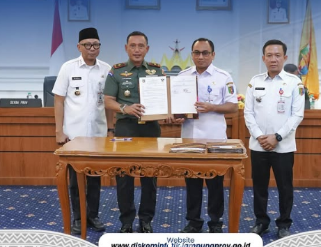 Penandatanganan dilakukan oleh Plt. Kepala BPKAD Provinsi Lampung, Nurul Fajri, bersama Pangdam XXI/Radin Inten, Mayjen TNI Kristomei Sianturi, Danrem 043/Garuda Hitam, Brigjen TNI Haryantana, serta perwakilan unsur TNI dan Polri.