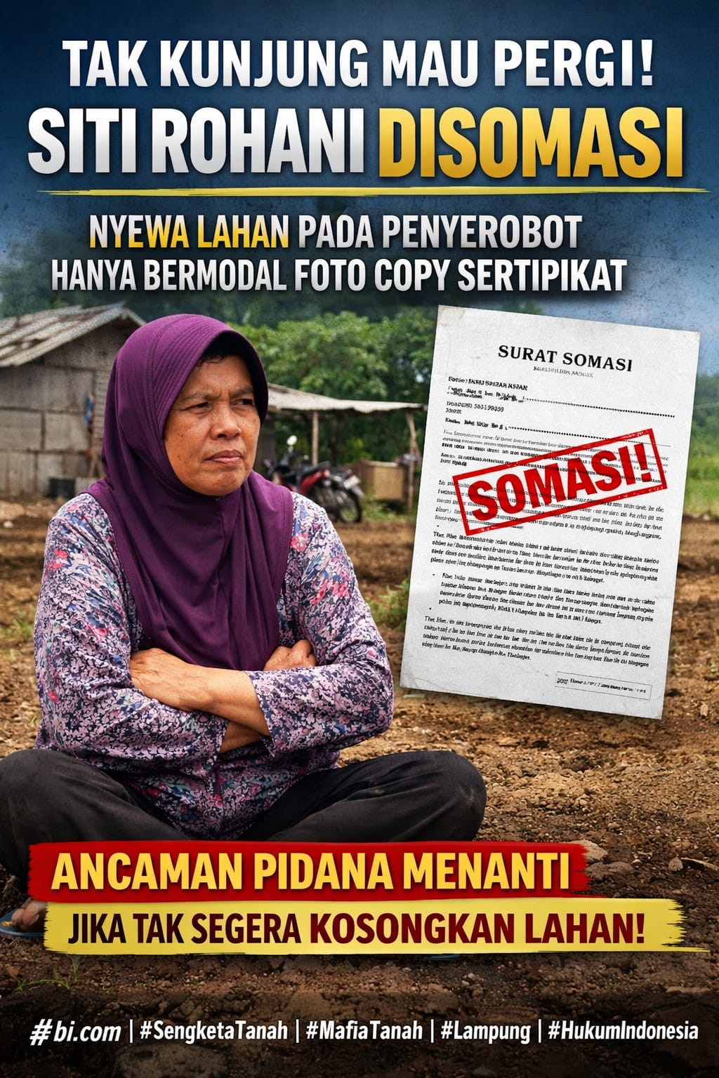 Selidikpost.com, Lampung – Polemik sengketa lahan kembali mencuat setelah Siti Rohani dilaporkan belum meninggalkan lokasi yang tengah disengketakan, meskipun telah dilayangkan somasi resmi oleh kuasa hukum pihak yang mengklaim sebagai pemilik sah.