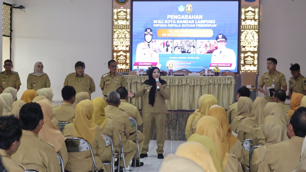 Bandar Lampung, SelidikPost.com – Wali Kota Bandar Lampung Hj. Eva Dwiana memberikan pengarahan kepada seluruh Kepala TK, SD, dan SMP se-Kota Bandar Lampung yang berlangsung di Aula Mufakat Jejamo, Dinas Pendidikan dan Kebudayaan Kota Bandar Lampung, Senin (20/04/2026).