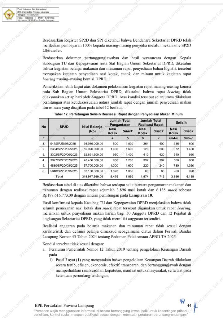 Berdasarkan hasil audit BPK Perwakilan Provinsi Lampung, terdapat kelebihan pengadaan sebanyak 3.896 nasi kotak dan 6.138 snack yang tidak sebanding dengan jumlah rapat yang berlangsung. Dari selisih tersebut, nilai anggaran yang tidak sesuai mencapai Rp197.616.773.