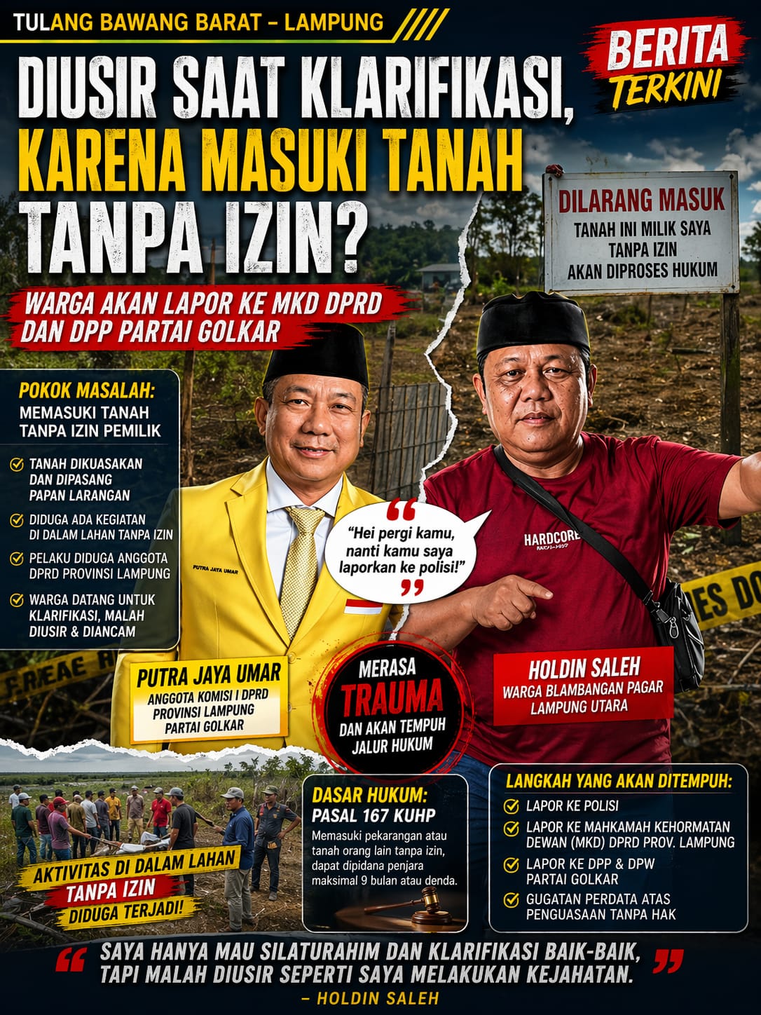 Tulang Bawang Barat, SelidikPost.com – Dugaan perbuatan memasuki tanah tanpa izin menjadi pokok persoalan dalam konflik yang melibatkan warga Blambangan Pagar, Lampung Utara, Holdin Saleh, dengan seorang anggota DPRD Provinsi Lampung.